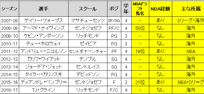 ジャミアネルソン(セントジョセフ)やデビッドウェスト(ゼイビア)はやはり突出した存在であることがわかります。さらに遡ればマーカスキャンビー(UMass)らがいますが、、、A10ほどの名門カンファレンスで、たとえPOYを獲得しても、それでもNBAは保証されない。